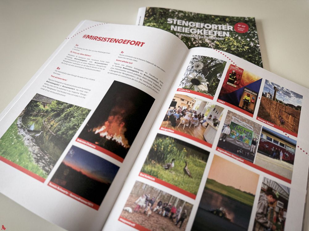 Would you like to see your photo published in the #MIRSISTENGEFORT section of an upcoming edition of our municipality magazine, Stengeforter Neiegkeeten? If so, tag your Instagram or Facebook photos with the hashtag #mirsistengefort or #coversteinfort. The most interesting photos will be published in the magazine, and the best ones could even make the cover page of one of our publications!