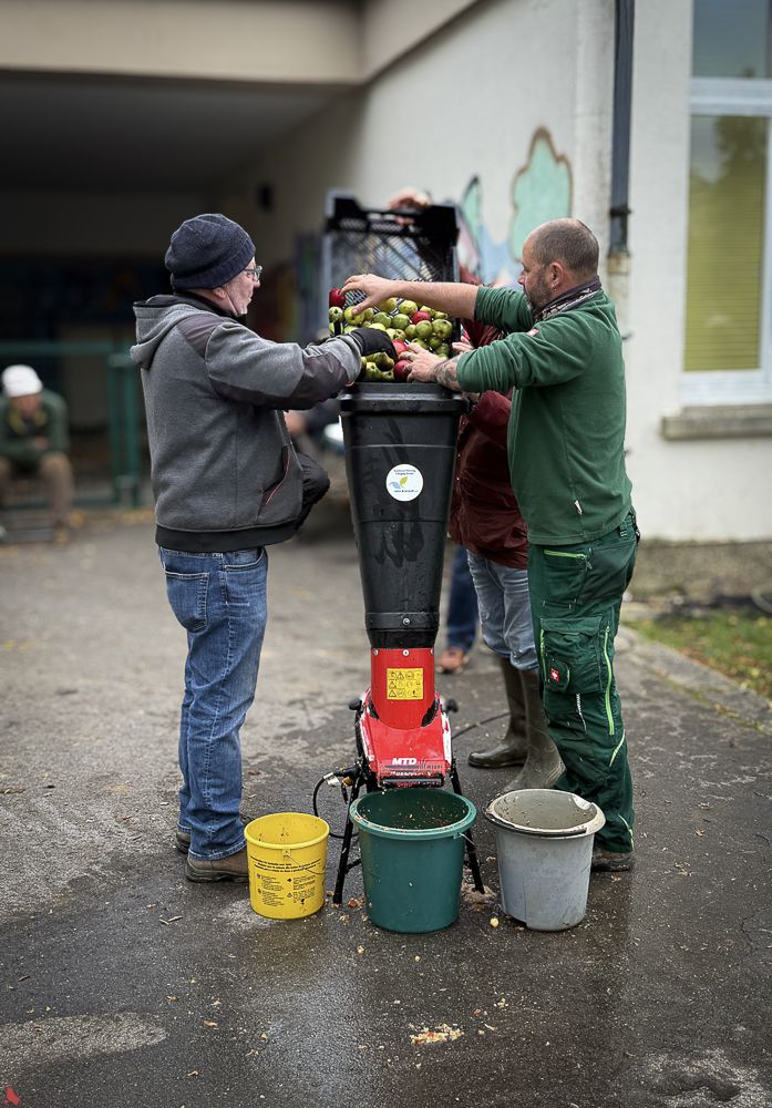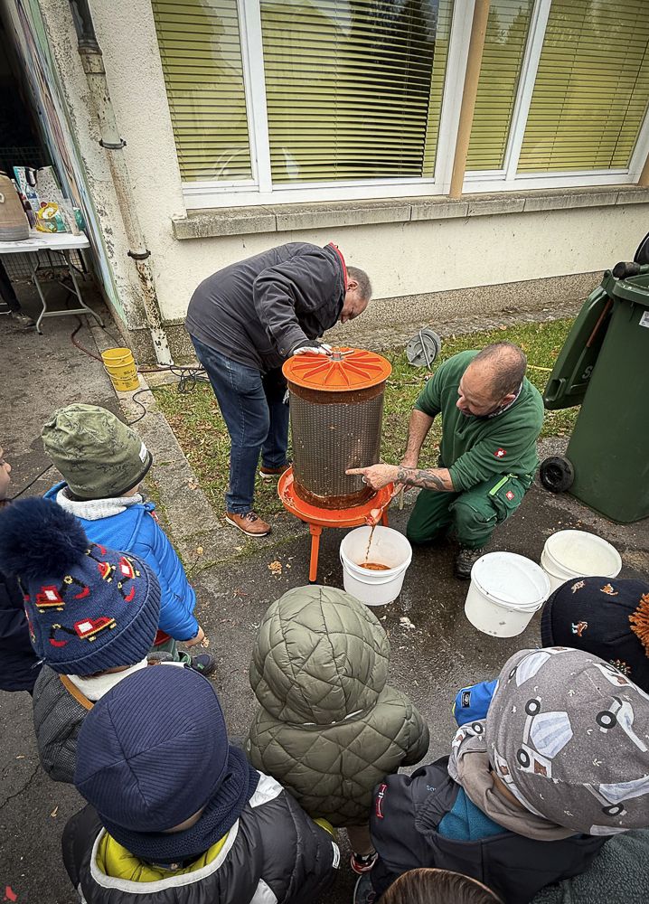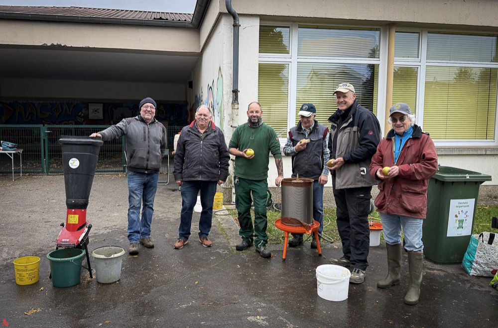 Mat groussen Tuten an der passender Kleedung, sinn d’Kanner mam Léierpersonal an de Bongert vun der Associatioun gaangen, fir Äppel ze plécken an ze rafen. Duerno hunn si der Ekipp gehollef, d’Äppel zu leckerem Jus ze pressen. Als Stäerkung gouf et e Stéck hausgemaachten Äppeltaart, an natierlech konnten d’Kanner hir Waasserfläsche mat frëschem Jus fëllen!