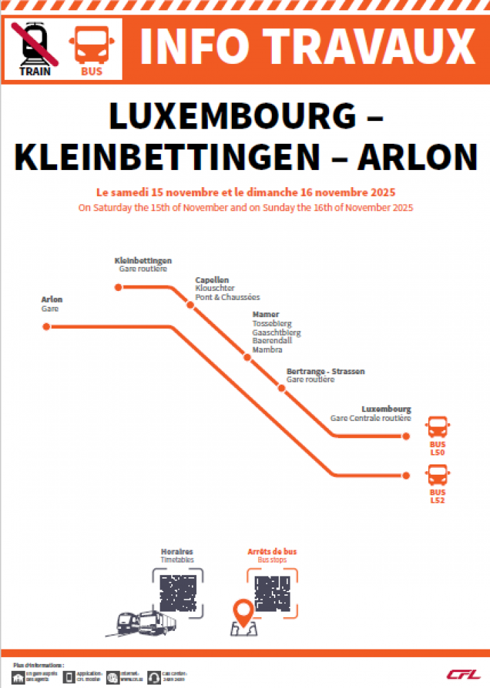 Les CFL informent qu'en raison de travaux sur la ligne 50, des bus de remplacement sont prévus entre la gare de Luxembourg-Ville et la gare de Kleinbettingen, resp. celle d'Arlon, du 15 au 16 novembre 2025.