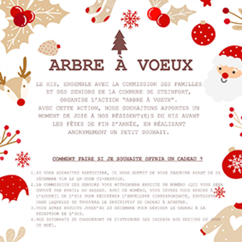 L’HIS, ensemble avec la commission de la famille et seniors de la commune de Steinfort, organise l'action "Arbre à vœux". Avec cette action, nous souhaitons apporter un moment de joie à nos résident·e·s du HIS avant les fêtes de fin d'année, en réalisant anonymement un petit souhait.
