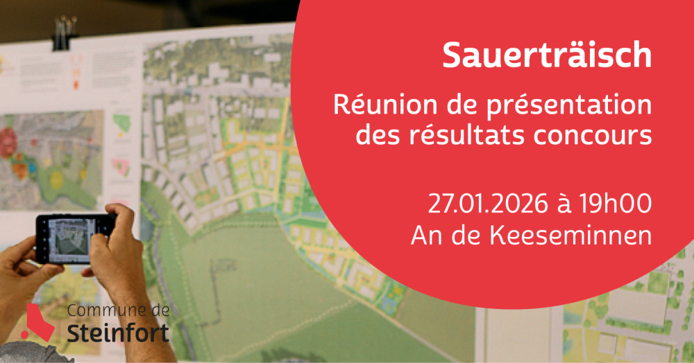 Le Collège échevinal de Steinfort vous invite à la présentation des résultats du concours relatif au futur développement du site « Sauerträisch ».