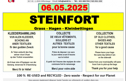 LU Dënschdes, den 6. Mee 2025, ass Kleedersammlung an der Gemeng Stengefort. Stellt Är neutral Tute mat ale... Lire plus
